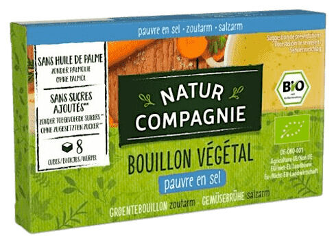 skrobia kukurydziana*, tłuszcz shea*, warzywa* (11,5 %) (marchew* 3,6 %, SELER*, cebula* 3,6 %, dynia*), sól morska, koncentrat soku warzywnego* (marchew*, cebula*), ekstrakt drożdżowy, przyprawy* (gałka muszkatołowa*, korzeń lubczyku*, kurkuma*, pieprz*, nasiona kopru włoskiego*), liście lubczyku*, czosnek*, olej słonecznikowy* (*certyfikowany składnik ekologiczny)