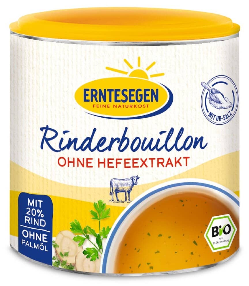 sól kamienna, skrobia kukurydziana*, mięso z wołowiny w proszku* 20,8 %, olej słonecznikowy*, cebula prażona*, pasternak* 1,3 %, ekstrakt z cykorii*, pietruszka*, sok z marchwi*, kurkuma*, czosnek*, gałka muszkatołowa*, kwiat muszkatołowy*. (*certyfikowany składnik ekologiczny)