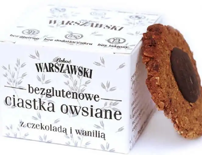 płatki OWSIANE bezglutenowe, mąka owsiana bezglutenowa, mąka ryżowa, rodzynki, olej kokosowy, siemię lniane, ksylitol (substancja słodząca), czekolada gorzka bez dodatku cukru (miazga kakaowa, substancje słodzące [erytrytol 29,5%, glikozydy stewiolowe 0,027%], masa kakaowa, inulina, odtłuszczone kakao w proszku, emulgator [lecytyna sojowa], aromat waniliowy, masa kakao min. 60%), wanilia, sól kłodawska