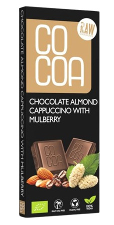 Ta autorska surowa czekolada to prawdziwa gratka dla miłośników czekolad! Jest subtelna w smaku i pozbawiona mocnej goryczy. Surowa czekolada zapewnia nam intensywny smak ziaren peruwiańskiego kakaowca, które świetnie komponują się z słodyczą owoców morwy białej oraz dodatku MIGDAŁÓW oraz kawy cappuccino. Ta kombinacja zaskoczy pozytywnie niejednego smakosza słodkich przekąsek!