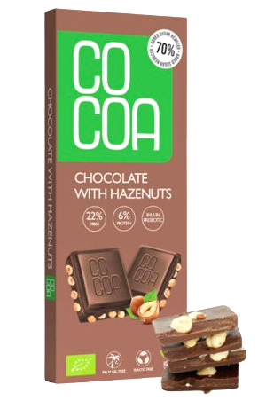 Roztarte wraz z ziarnem kakao MIGDAŁY przełamują czekoladową gorycz nadając tabliczce delikatnie “mlecznego” akcentu. Kakao jest wciąż wyczuwalne, nie w dominującej formie jednak, a raczej, wraz z roztartymi migdałami tworzy tło dla wyrazistego smaku orzechów laskowych.
