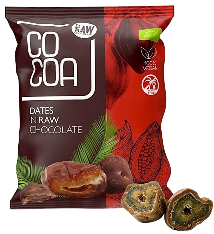 czekolada* 50% (nieprażone ziarno kakaowca*, cukier z kwiatu palmy kokosowej*, tłuszcz kakaowy*, wanillia Bourbon*), daktyle*50% (*certyfikowany składnik ekologiczny)