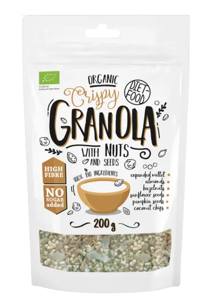 Diet-Food Granole to świetny produkt śniadaniowy zalej go ulubionym mlekiem, jogurtem bądź dowolnym sokiem owocowym lecz możesz go jeść bezpośrednio z opakowania jako formę przekąski.