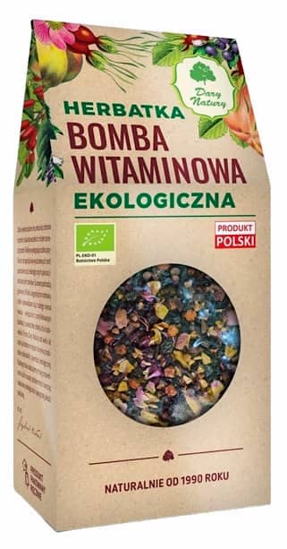 róża owoc*, jabłko owoc*,tarnina owoc*, borówka wysoka owoc*, berberys owoc*, bez czarny owoc*, jarzębina owoc*, porzeczka czarna owoc*, głóg owoc*, hibiskus kwiat*, malina owoc*, róża płatki* (*certyfikowany składnik ekologiczny)
