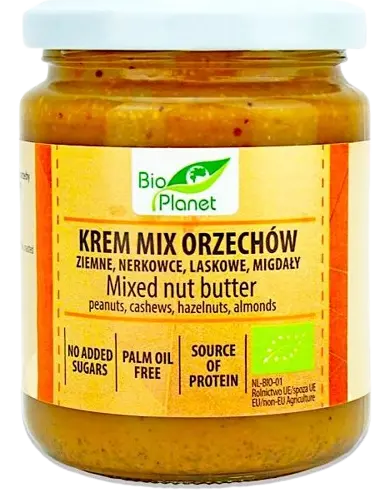 prażone ORZESZKI ZIEMNE* 49,7 %, prażone ORZECHY NERKOWCA* 20 %, prażone ORZECHY LASKOWE* 15 %, prażone MIGDAŁY* 15 %, sól morska (*certyfikowany składnik ekologiczny).