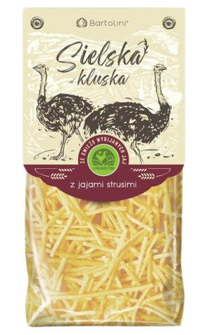 Makaron rzemieślniczy wyrabiany wyłącznie z ekologicznej semoliny oraz świeżo wybijanych jaj strusich pozyskiwanych z polskich gospodarstw rolnych.