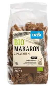 Jeżyki ekologiczny makaron pełnoziarnisty z płaskurki. Makaron jest wytwarzany z mąki z płaskurki.