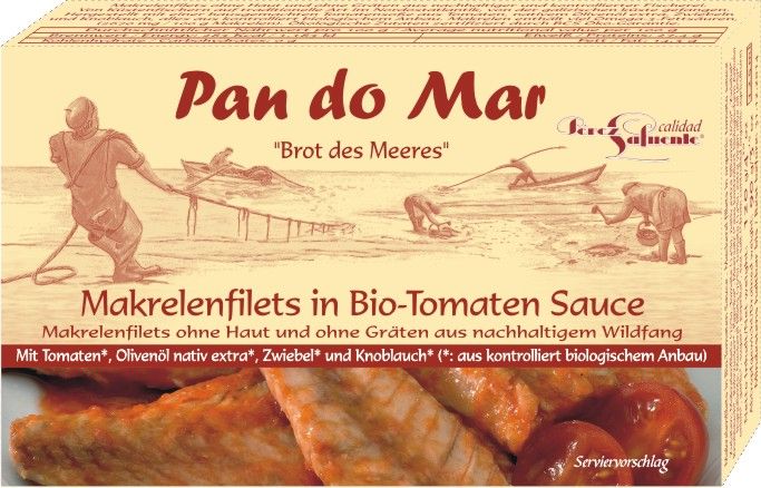 filety z makreli75 %, pomidor* 14 %, oliwa z oliwek extra virgin* 6 %, cebula*, czosnek*, sólmorska (* składnik z rolnictwa ekologicznego). 24 % składników pochodzi zcertyfikowanych upraw ekologicznych.