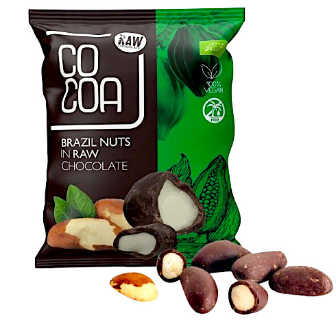 czekolada* (50%) (nieprażone ziarna kakaowca*, cukier z kwiatu palmy kokosowej*, tłuszcz kakaowy*, wanillia Bourbon*), ORZECHY BRAZYLIJSKIE* (50%) (*certyfikowany składnik ekologiczny).