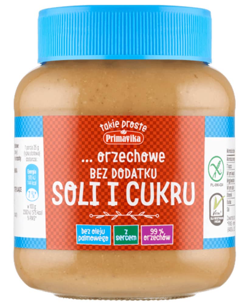 Pasta orzechowa z prażonych orzeszków arachidowych, bez dodatku soli i cukru. Bez dodatku cukru. Zawiera naturalnie występujące cukry. Źródło białka. Wysoka zawartość błonnika pokarmowego.