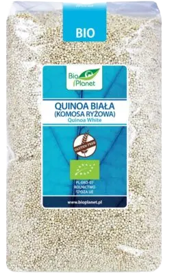 Ekologiczna quinoa biała, znana również jako komosa ryżowa. Z powodzeniem zastępuje tradycyjne kasze lub makarony. Doskonale sprawdza się jako składnik zup oraz dodatek do warzyw, sosów, wypieków, a także deserów.