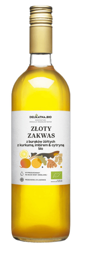 woda, buraki żołte* 20 %, kurkuma* 5 %, imbir* 5 %, cytryna* 5 %, czosnek*, sól, liść laurowy*, ziele angielskie* (* certyfikowany składnik ekologiczny)